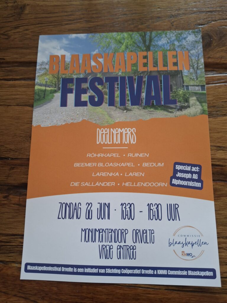 - 22 juni 2025 Orvelte, i.v.m. weersverwachting 31 graden op vermelde datum, wordt het optreden verplaatst naar het najaar 2025 .